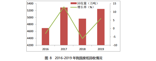 2019 年,我國廢紙回收量約 5244 萬噸,同比增長5.6%,廢紙回收率為 49.0%,廢紙利用率為 58.3%。在固體廢物進口政策影響下,進口廢紙量持續(xù)下滑,國內廢紙回收量呈上升趨勢。2016-2019 年我國廢紙回收情況如圖 8 所示。