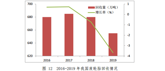 2019年,我國汽車輪胎產量為6.5億條,其中國內消耗約3.8億條。2019年,廢輪胎回收利用企業(yè)約1500家,從業(yè)人員約10萬人,回收量約2億條,回收重量約655萬噸,同比下降3.7%。其中,輪胎翻新量約500萬標準折算條,再生橡膠產量約300萬噸,橡膠粉產量約100萬噸,熱裂解處理量約100萬噸。2016-2019年我國廢輪胎回收情況如圖12所示。