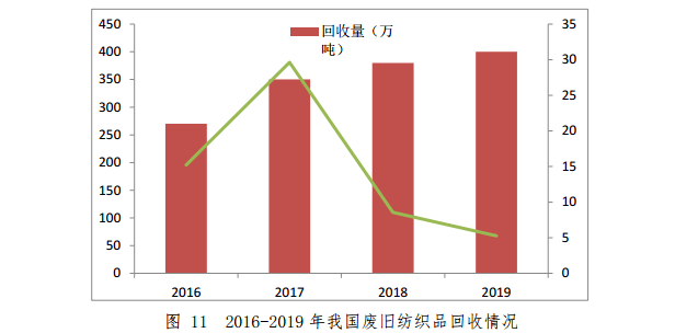 2019 年,我國棉、化纖和絲三類紡織纖維加工量約6610萬噸。據估算,每年產生廢舊紡織品超過 2000 萬噸,一類是消費前工業(yè)加工領域的邊角料等,基本得到再生利用,另一類是閑散在居民手中的大量廢舊衣物和紡織品,再生利用率約 15%。2019年,我國廢舊紡織品回收量約為 400 萬噸, 同比增長 5.3%。2016-2019年我國廢舊紡織品回收情況如圖 11 所示。