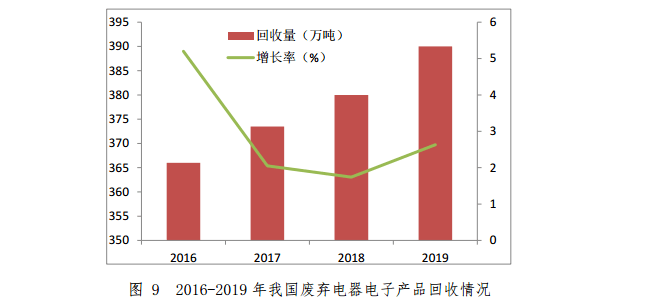 截至 2019 年底,全國共有 29 個省(區(qū)、市)的 109 家廢棄電器電子產品拆解處理企業(yè)納入廢棄電器電子產品處理基金補貼企業(yè)名單,電視機、微型計算機、洗衣機、電冰箱和空氣調節(jié)器的回收量約 17100 萬臺,報廢重量超過390萬噸。2016-2019 年我國廢棄電器電子產品回收情況如圖9所示。