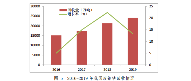 2019年,我國粗鋼和鋼材產量分別為9.96億噸和12.05億噸,同比增長8.3%和9.8%,粗鋼產量再創(chuàng)歷史新高;回收廢鋼鐵約24097萬噸1,同比增長13.3%。其中,重點大型鋼鐵企業(yè)回收廢鋼鐵約21597萬噸,同比增長15.0%;其他企業(yè)回收廢鋼鐵約2500萬噸,與2018年持平;廢鋼單耗為216.7kg/t 鋼,同比增加14.4kg/t鋼,增幅為7.1%,綜合廢鋼比21.67%, 同比增加1.49個百分點。2016-2019年我國廢鋼鐵回收情況如圖5所示。