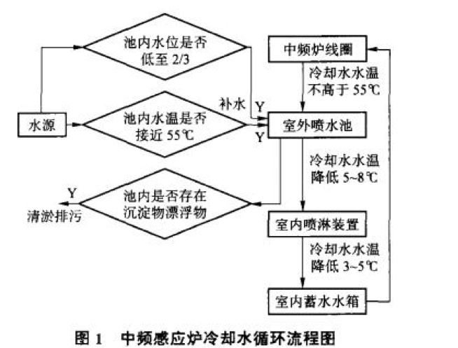 該冷卻系統(tǒng)以潛水泵為動(dòng)力,噴水池和噴淋架為兩級(jí)冷卻裝置,以達(dá)到中頻爐冷卻水循環(huán)使用的目的。當(dāng)水溫超過(guò)中頻爐冷卻要求<(55℃)及水量蒸發(fā)損失較多時(shí),則由補(bǔ)水管路及時(shí)補(bǔ)充,同時(shí)及時(shí)排污,保持清潔?!鋮s水池還可為噴水池周邊綠地灌溉,使水資源得到綜合利用。