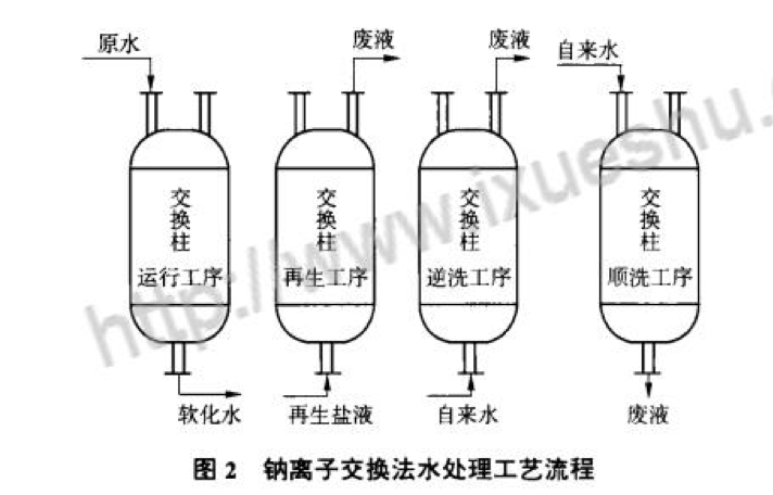 針對(duì)上述問(wèn)題,采取了下列解決辦法引入去除了鈣鎂離子的軟化水來(lái)冷卻中頻爐。常用的水處理工藝是鈉離子交換法見(jiàn)圖,其原理是用樹(shù)脂中的鈉離子將水中容易結(jié)垢的鈣鎂離子置換出來(lái),減少結(jié)垢,提高換熱效率。用酸洗劑加緩蝕劑清洗中頻爐線圈、管路和噴淋架,去除水垢。檢修水泵、閥門(mén)和管路,治理泄漏。
