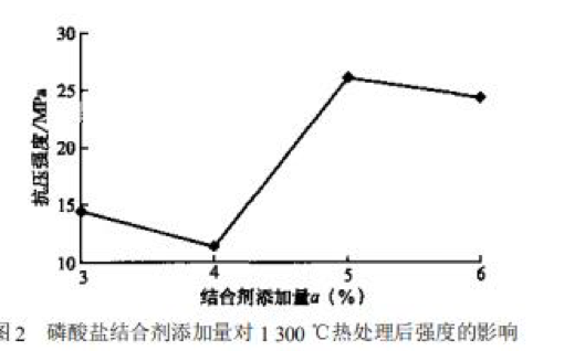 圖1、圖2是以磷酸鹽為結(jié)合劑、Al-80水泥為固化劑的四個配方試樣的性能檢測結(jié)果,隨著結(jié)合劑添加量的增大,110℃×24h烘干后澆注料試樣的抗壓強度呈上升趨勢,但在≤4%和≥5%的添加量范圍內(nèi),隨結(jié)合劑添加量的增加試樣的抗壓強度增大幅度很小,而在4%~5%的范圍內(nèi),抗壓強度隨結(jié)合劑添加量的增加而急劇提高。對于經(jīng)1300℃熱處理后的試樣,結(jié)合劑添加量在≤4%和≥5%的范圍內(nèi),試樣的抗壓強度隨結(jié)合劑的增加而呈微弱的下降趨勢,但抗壓強度隨結(jié)合劑添加量的增加而急劇提高。綜合可見,對于本實驗選擇的原材料與實驗范圍內(nèi),磷酸鹽結(jié)合劑合理的添加量為4%~5%。