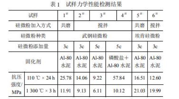 表1是以不同種類、不同添加量的硅微粉為結(jié)合劑和以磷酸鹽、Al-80水泥為固化劑的澆注料力學性能檢測結(jié)果。由表1可見,硅微粉的種類、加入方式、添加量以及固化劑種類對試樣的力學性能影響較大。由1#、2#試樣和5#、6#試樣的檢測結(jié)果可見,與硅微粉的直接攪拌加入方式相比,共磨加入方式能明顯改善澆注料的力學性能。由3#、4#試樣的檢測結(jié)果可見,固化劑種類對澆注料性能影響較大,并可看出磷酸鹽與Al-80水泥組成的復合固化劑具有明顯改善修補料性能的效果,而Al-80水泥則效果不明顯。由2#、3#試樣的檢測結(jié)果可見,硅微粉添加量的提高未能提高澆注料的力學性能。由采用相同的加入方式而硅微粉來源不同的1#、5#和2#、6#試樣的檢測結(jié)果可見,??瞎栉⒎叟c武鋼硅微粉相比,能明顯改善澆注料熱處理后的力學性能,并且添加??瞎栉⒎鄣臐沧⒘峡箟簭姸入S試樣的熱處理溫度的提高而不斷增大。綜合可見,宜采用??瞎栉⒎圩鳛殒V質(zhì)澆注料的結(jié)合劑,合適的添加量應為3c%左右。