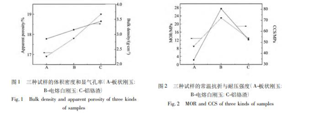 中頻爐內(nèi)襯材料板狀剛玉、電熔白剛玉、鋁鉻渣三種試樣的體積密度、顯氣孔率、常溫抗折強度和常溫耐壓強度如圖 1、 圖 2 所示。由圖可知,板狀剛玉試樣顯氣孔率最小,鋁鉻渣顯氣孔率最大,但是板狀剛玉的體積密度小于鋁鉻渣的體積密度。電熔白剛玉的顯氣孔率和體積密度雖處于板狀剛玉和鋁鉻渣兩者之間,但電熔白剛玉試樣常溫抗折和耐壓強度最大。因此就中頻爐內(nèi)襯材料綜合性能而言,電熔白剛玉試樣最佳。