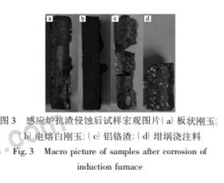 對上述四種中頻爐內(nèi)襯試樣侵蝕部位進行觀察如圖 5 所示。試樣寬度均為 25 mm,板狀剛玉試樣被侵蝕約 5 mm, 電熔白剛玉試樣未觀察到宏觀侵蝕,鋁鉻渣試樣被侵蝕約 12 mm,坩堝澆注料試樣被侵蝕約 5 mm,按公式 ( 1) 計算試樣侵蝕指數(shù)如表 3 所示。 侵蝕指數(shù) R = 侵蝕面積 測量面積 × 100%