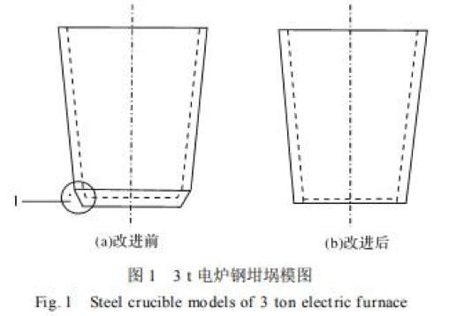3t中頻爐鋼坩堝模具的原始設(shè)計(jì)如圖1(a)所示。它是由兩個(gè)截短的空心錐體組成的鋼制坩堝模具。這種結(jié)構(gòu)的鋼制坩堝模具在建造熔爐時(shí)具有一個(gè)缺點(diǎn),即,(1)部分中的死砂不易結(jié)實(shí),并且容易引起鐵水泄漏。改進(jìn)的鋼制坩堝模具的形狀如圖1(b)所示,它是帶有截頭空心錐的鋼制坩堝模具。這種改進(jìn)有助于在熔爐制造過程中打結(jié)。沒有死角,從根本上解決了原始鋼制坩堝模具的打結(jié)(1)不易打結(jié)的問題。實(shí)踐證明,這種改進(jìn)是非常成功的,并且是延長(zhǎng)爐齡的關(guān)鍵之一。